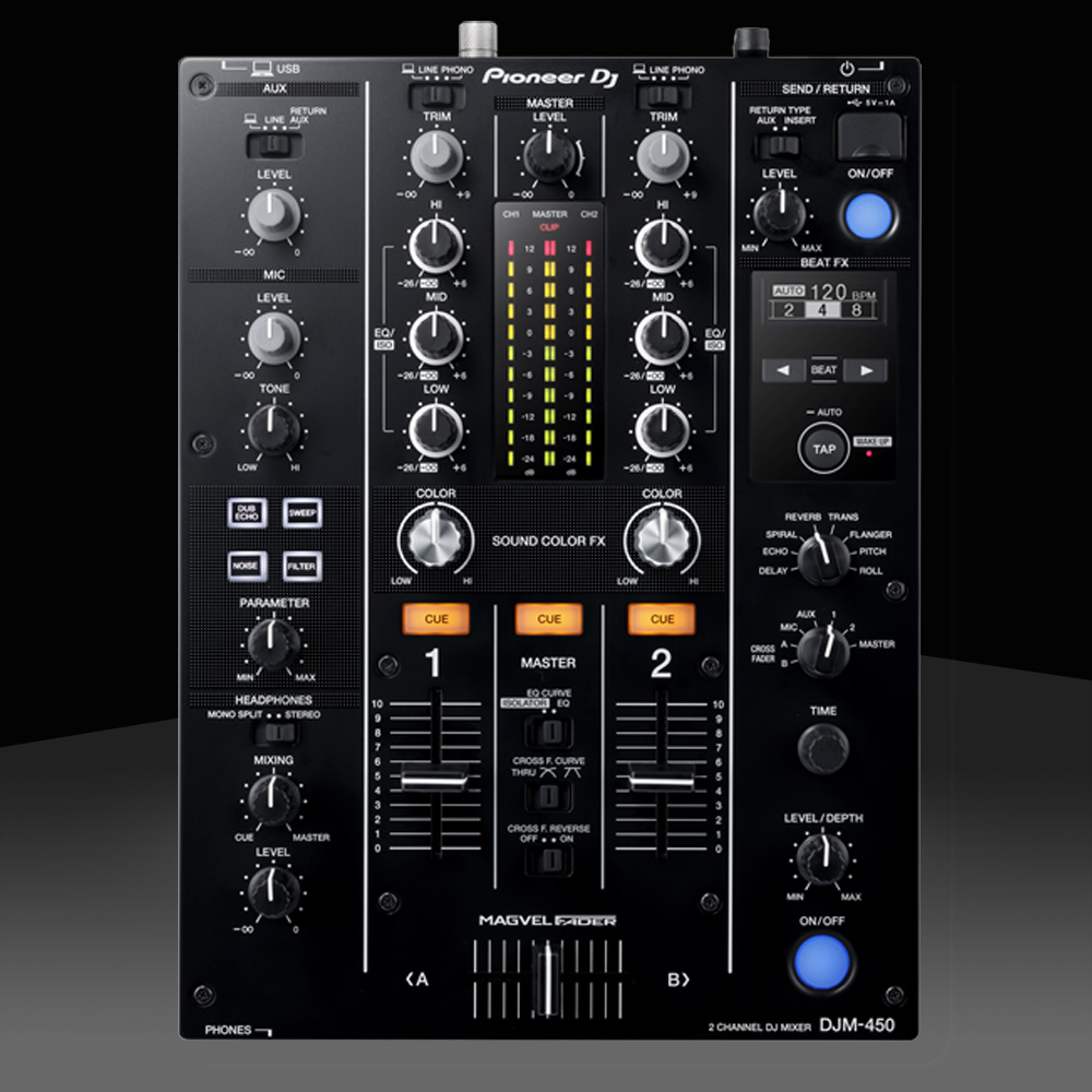 Der Pioneer DJM-450 ist ein 2-Kanal DJ-Mixer mit vielen Eigenschaften aus dem Flaggschiff DJM-900NXS2 und bietet somit ein professionelles Layout. Seine EQs, Kanal-Fader und der robuste Magvel-Crossfader sorgen für smoothes Mixen und der integrierte 64 Bit Digital-Signal-Prozessor mit Dithering-Technologie liefert dazu einen hochqualitativen Klang. Ferner stellt der DJM-450 professionelle Effekte mit detaillierten Kontrollmöglichkeiten bereit. Dazu gehören Sound-Colour-FX, Beat-FX und Send/Return mit der Möglichkeit externe Effekte einzubinden. Darüber hinaus ist der Pioneer DJ – DJM-450 Rekordbox DVS Hardware enabled, sodass Du Deine digitalen Tracks mit Turntables und einer speziellen Control-Vinyl steuern kannst.