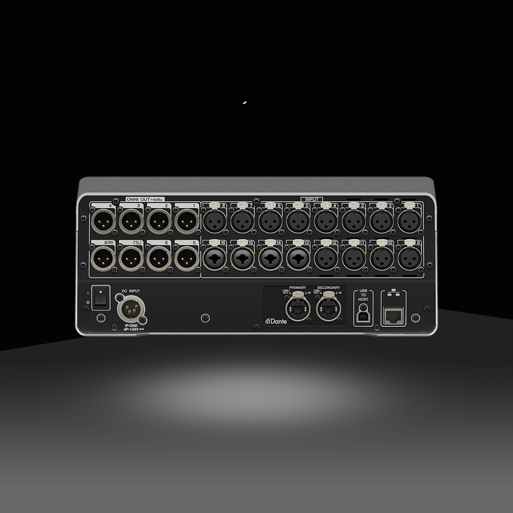 • Lokale I/O: 16 Mic/Line (12 XLR + 4 XLR/TRS Phones Combo) Eingänge und 8 (XLR) Ausgänge